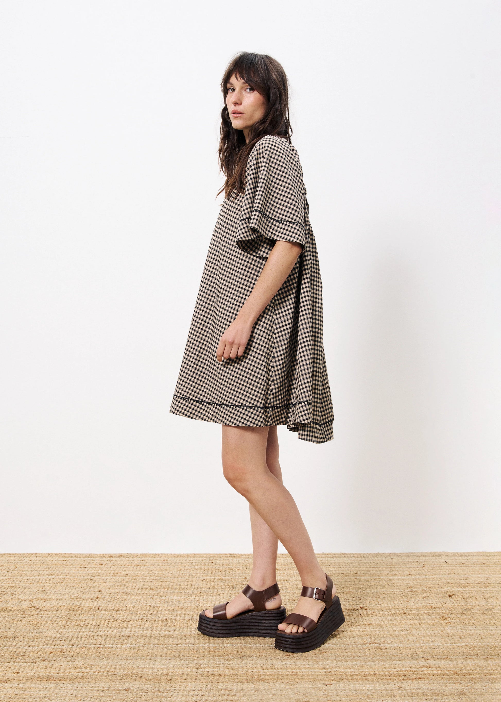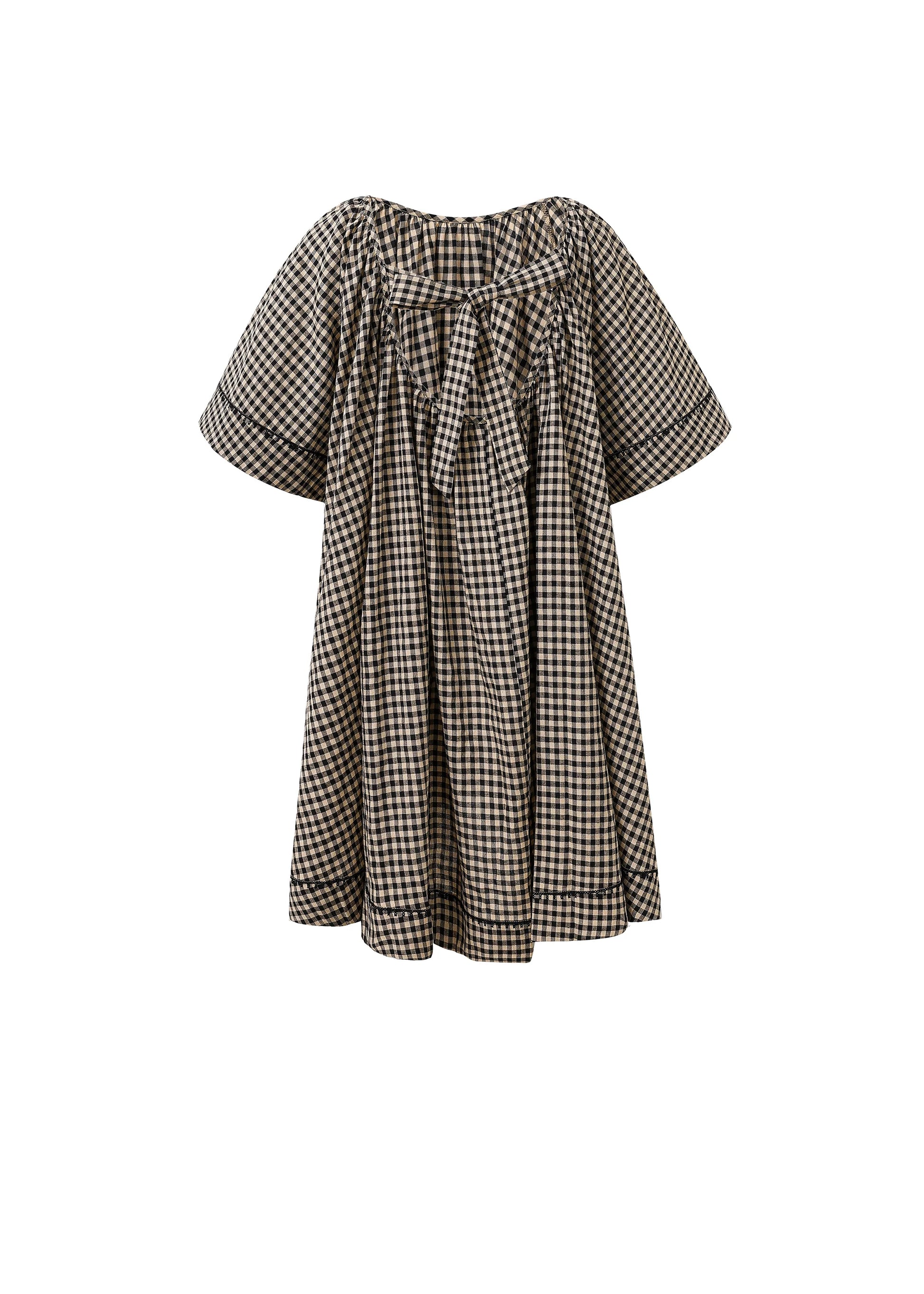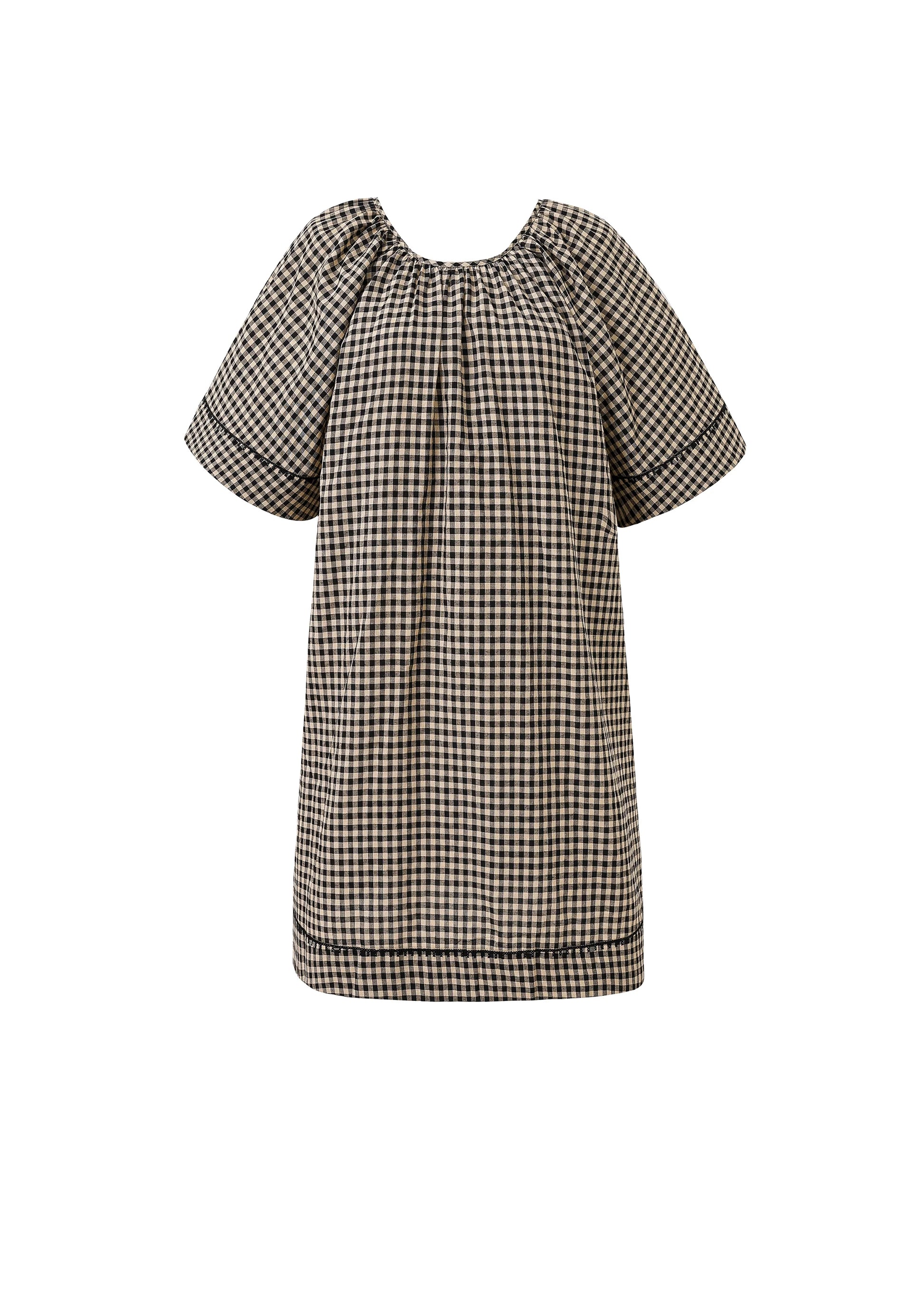 The Afida dress from FRNCH features a playful taupe and black small gingham print that flows gracefully. It also boasts a charming bow detail at the back.