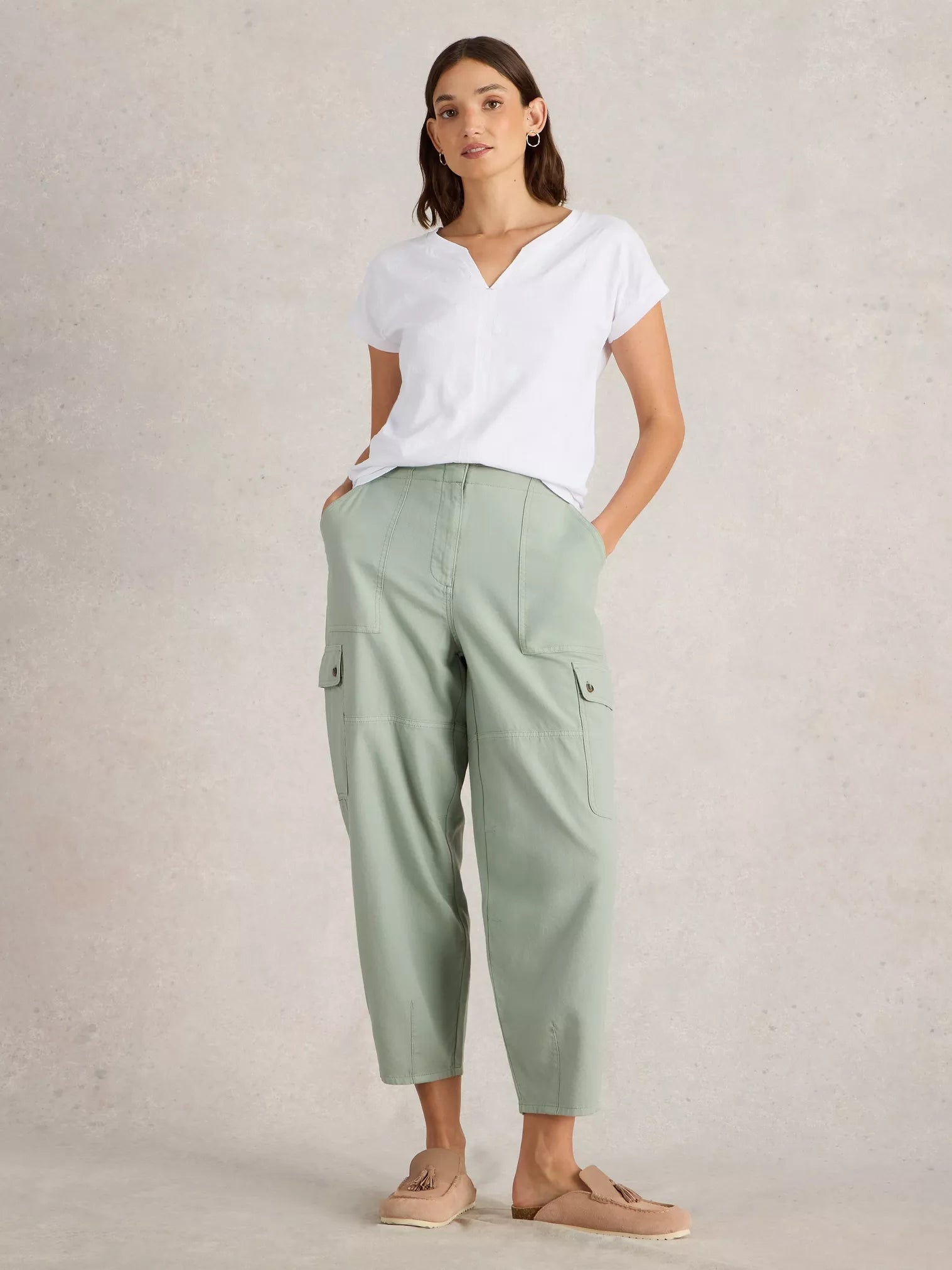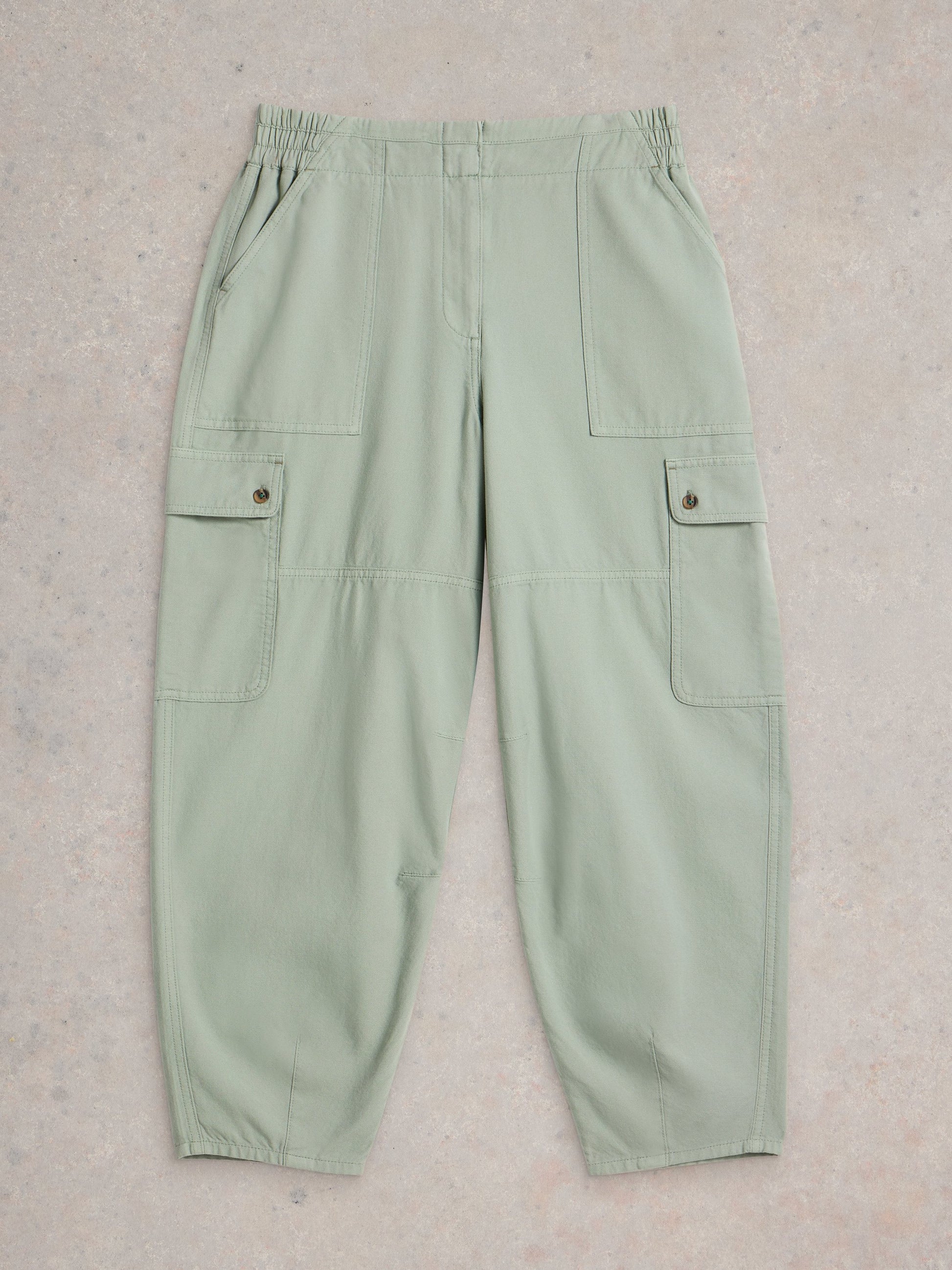 Introducing the Anabel Soft Green Barrel Pants by White Stuff. They come in a stunning green hue and are absolutely perfection. These stylish cargos come complete with spacious pockets (perfect for storing car keys, lip balm, and a sneaky treat). And don't forget the comfy elastic back waistband and cuffs. Pure comfort!