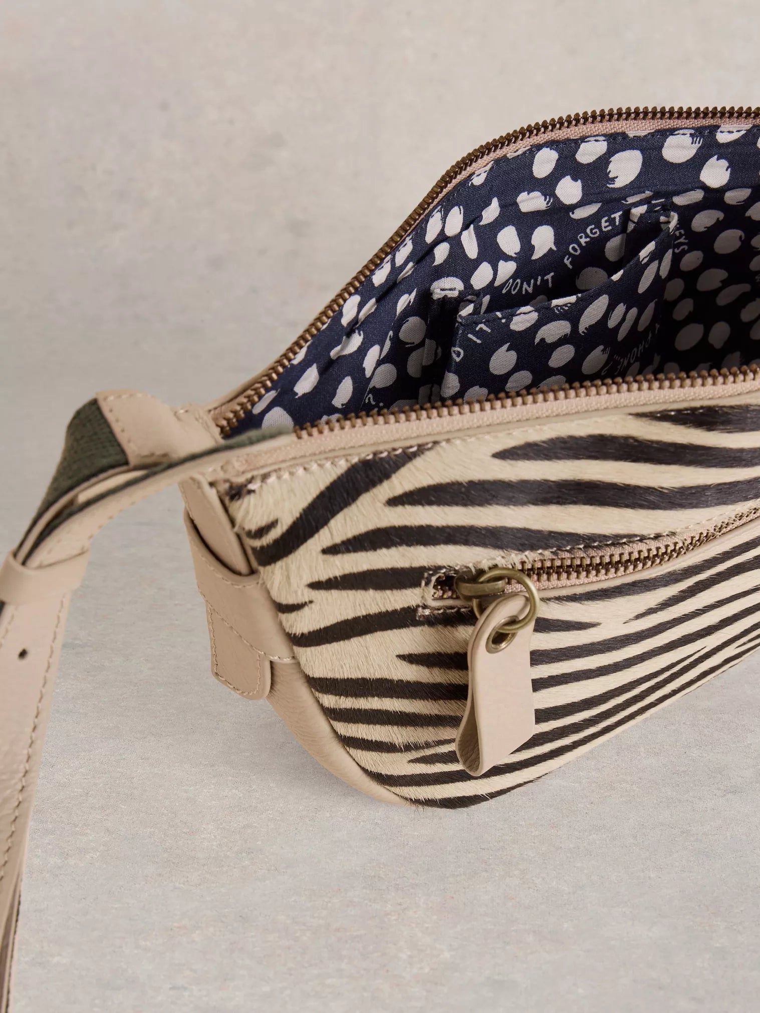 Introducing the Caro Crossbody Bag from White Stuff. Its crescent shape is updated for a modern twist. You'll be delighted by the multitude of zippered pockets and an adjustable strap for the perfect fit. Plus, who can resist the abstract zebra print in luxurious calf hair? We certainly can't!