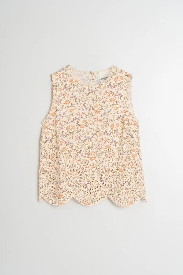 This playful embroidered top from Indi & Cold is made of cotton poplin and features a button closure and delicate embroidery on the bottom. With a slightly cropped fit and fitted shoulders, it adds a touch of fun to any outfit. Made from organic cotton with a digital liberty flower print and hand-cut embroidery details. She is a beauty.