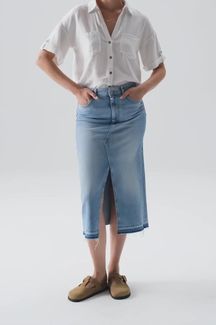 Designed with a flattering mid-rise waist and long, slim silhouette, this denim skirt offers both style and comfort thanks to its soft stretch fabric. The classic five-pocket design keeps it timeless, while the fringe hem adds a touch of effortless edge, perfect for dressing up with boots or keeping casual with sneakers or sandals.
