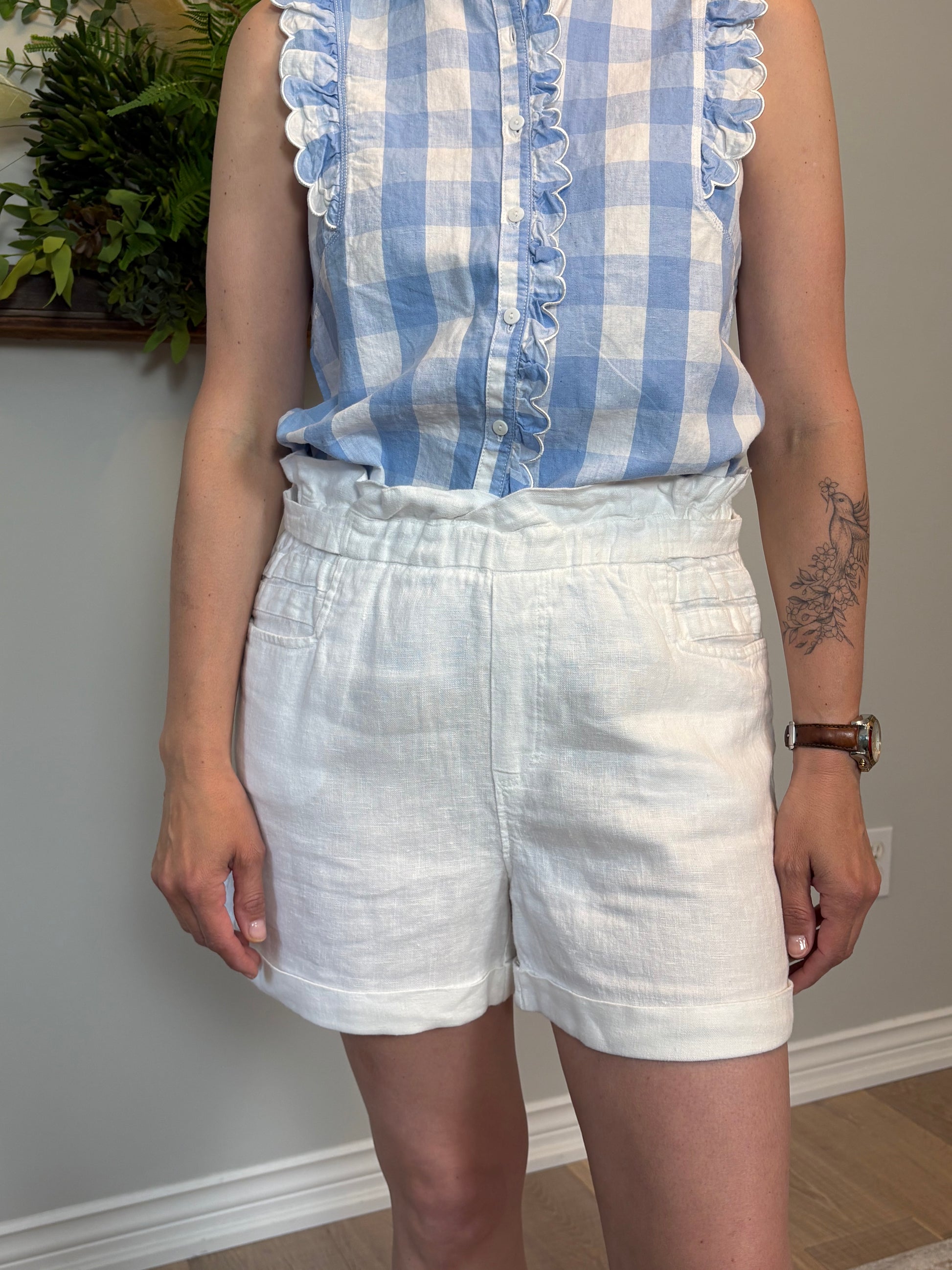 Elevate your summer style with the Garence Paper Bag Style Shorts by Melissa Nepton. Crafted from crisp white linen, these shorts offer a fresh and sophisticated look for any occasion. Featuring a trendy paper bag waist design, these shorts are both fashionable and comfortable. Pair them with a breezy blouse for a casual day out or dress them up with a chic top for an evening ensemble. Add a touch of effortless elegance to your wardrobe with the Garence Paper Bag Style Shorts. Perfect for warm-weather adventures and relaxed outings, they're a must-have staple for the season.
