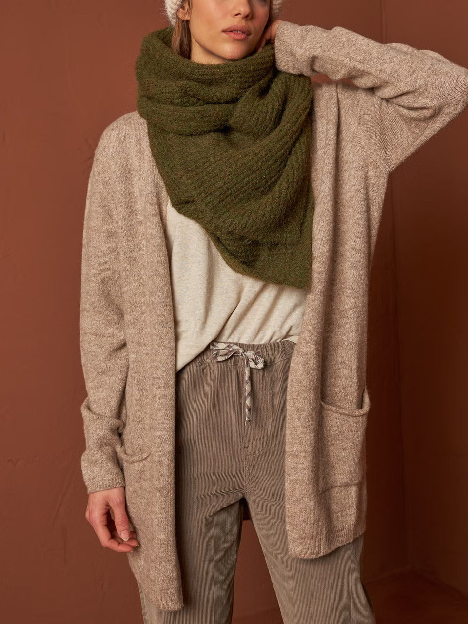 Get cozy and chic with our Knit Scarf in Khaki Green by Indi & Cold! This must-have accessory will keep you warm and add a pop of colour to your outfit. Perfect for those chilly days, this scarf will definitely make a statement.