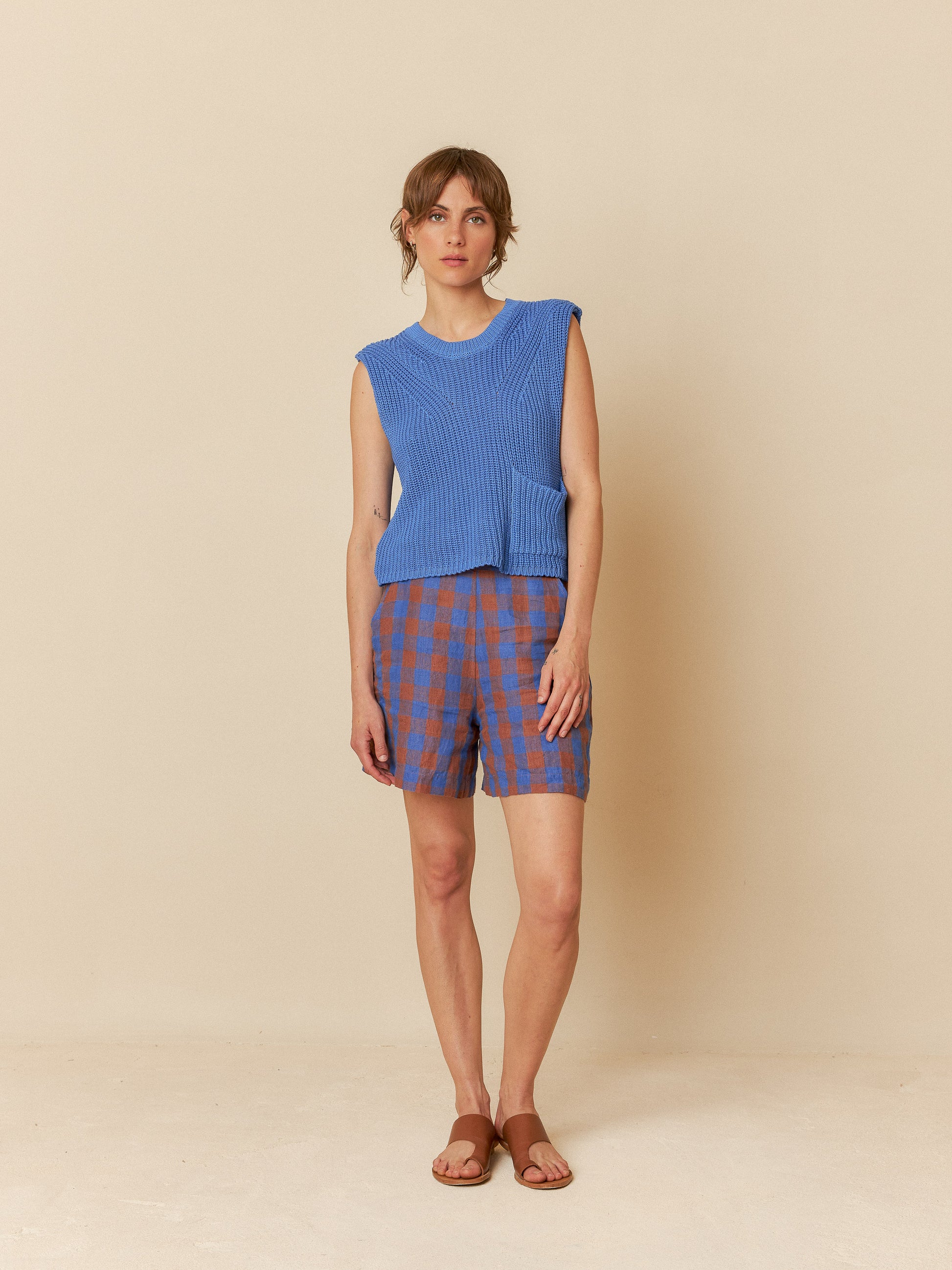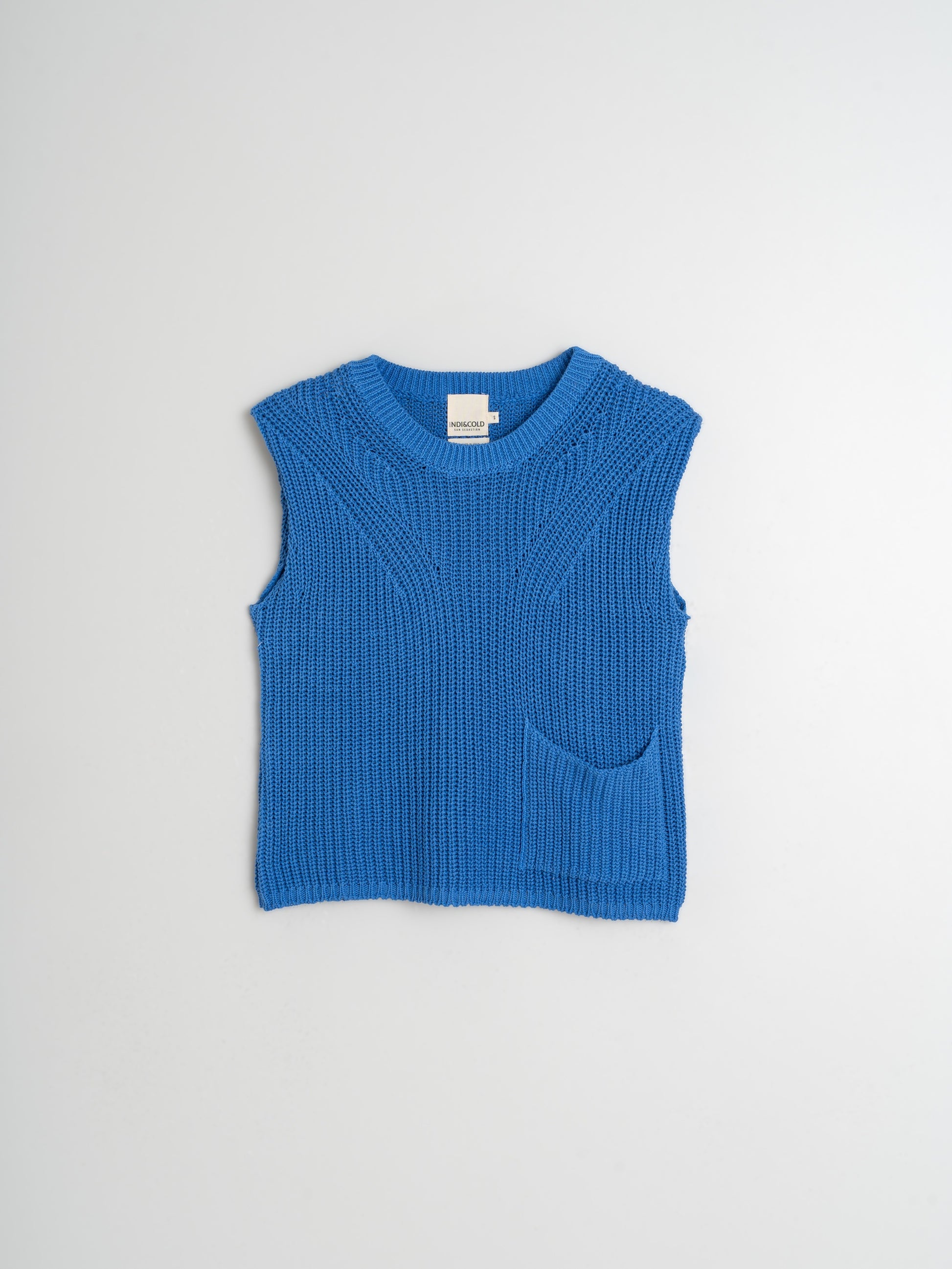 The Knitted Vest ~ Azul from Indi & Cold effortlessly meshes with any outfit, speaking a universal language. Its fitted shoulders, tucked armholes, and shoulder pad-like effect elevate your style game to the max. In a gorgeous cobalt blue hue and finished with ribbed details, this knit is delightfully boxy, giving you room to play around.