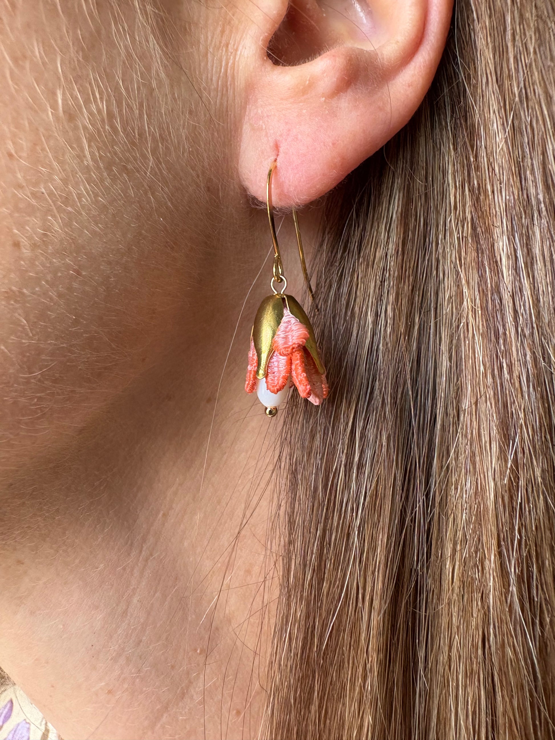 Crafted from vintage coral lace, hand-dyed and accented with nacre-white shell beads and raw brass details. Finished with hypoallergenic, gold-plated brass hooks for easy, comfortable wear—just the kind of earrings you’ll reach for on your way out the door.