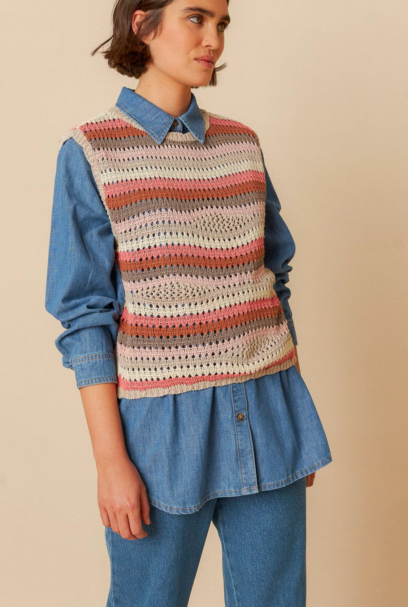 Give your style a twist with this multicolor crochet fantasy stitch vest. Its design and crochet fabric make it the ideal option when adding a cheerful touch to your outfits. With a regular fit, it's the perfect garment for those days when you want to be comfortable yet stylish.