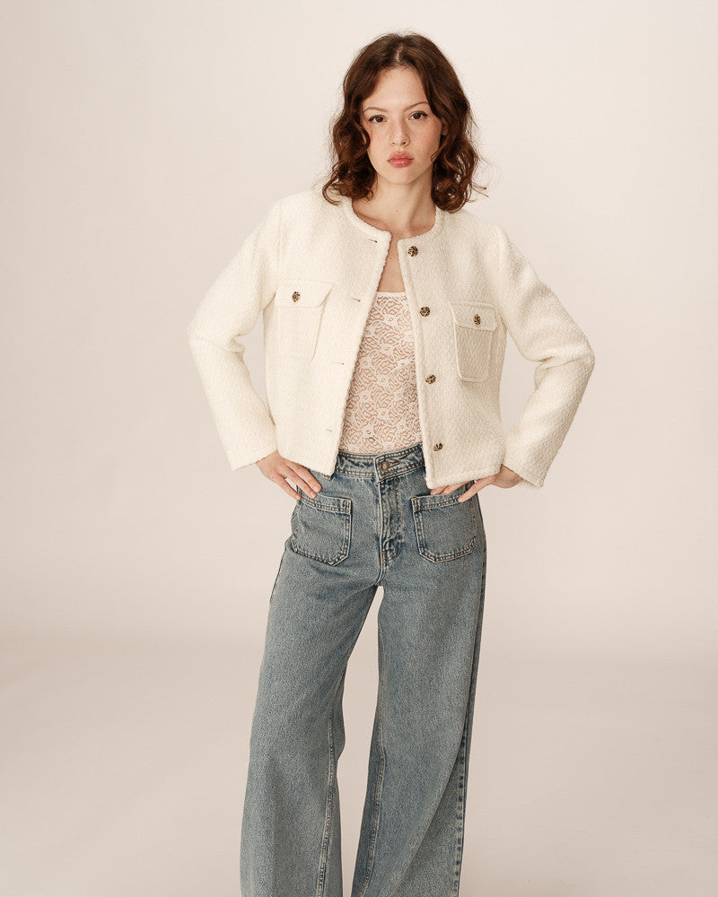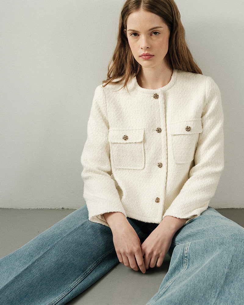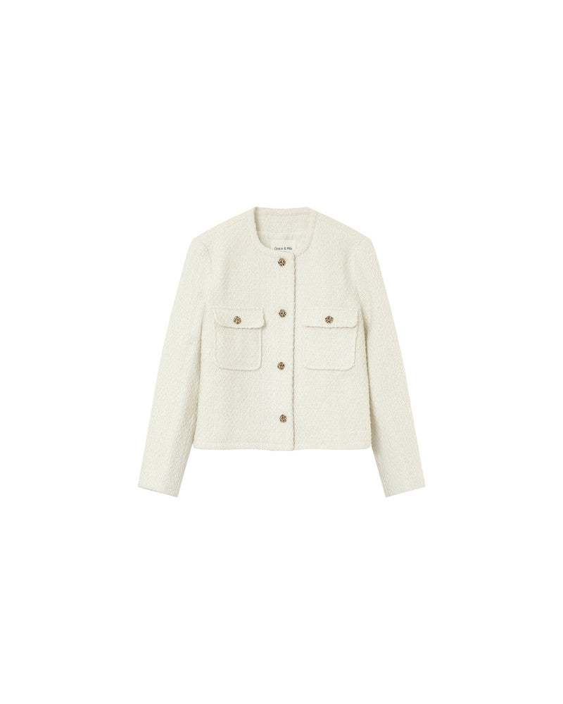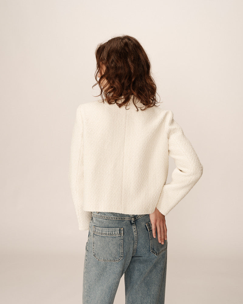 Channeling classic sophistication, the Prune tweed jacket by Grace & Mila exudes timeless elegance with its ecru hue, round neck, and gold buttons featuring intricate designs. Its straight cut and front button placket give this iconic piece an old money flair, perfect for achieving a refined look. Style it for the office with a skirt or jeans for a chic casual look.