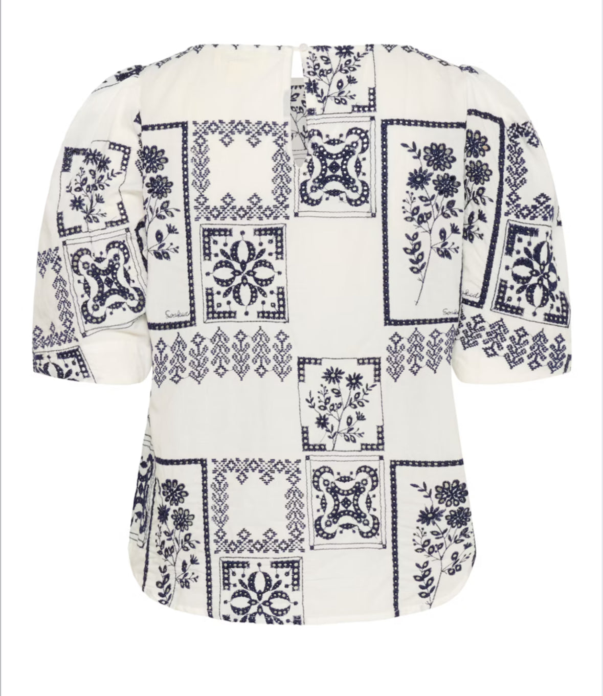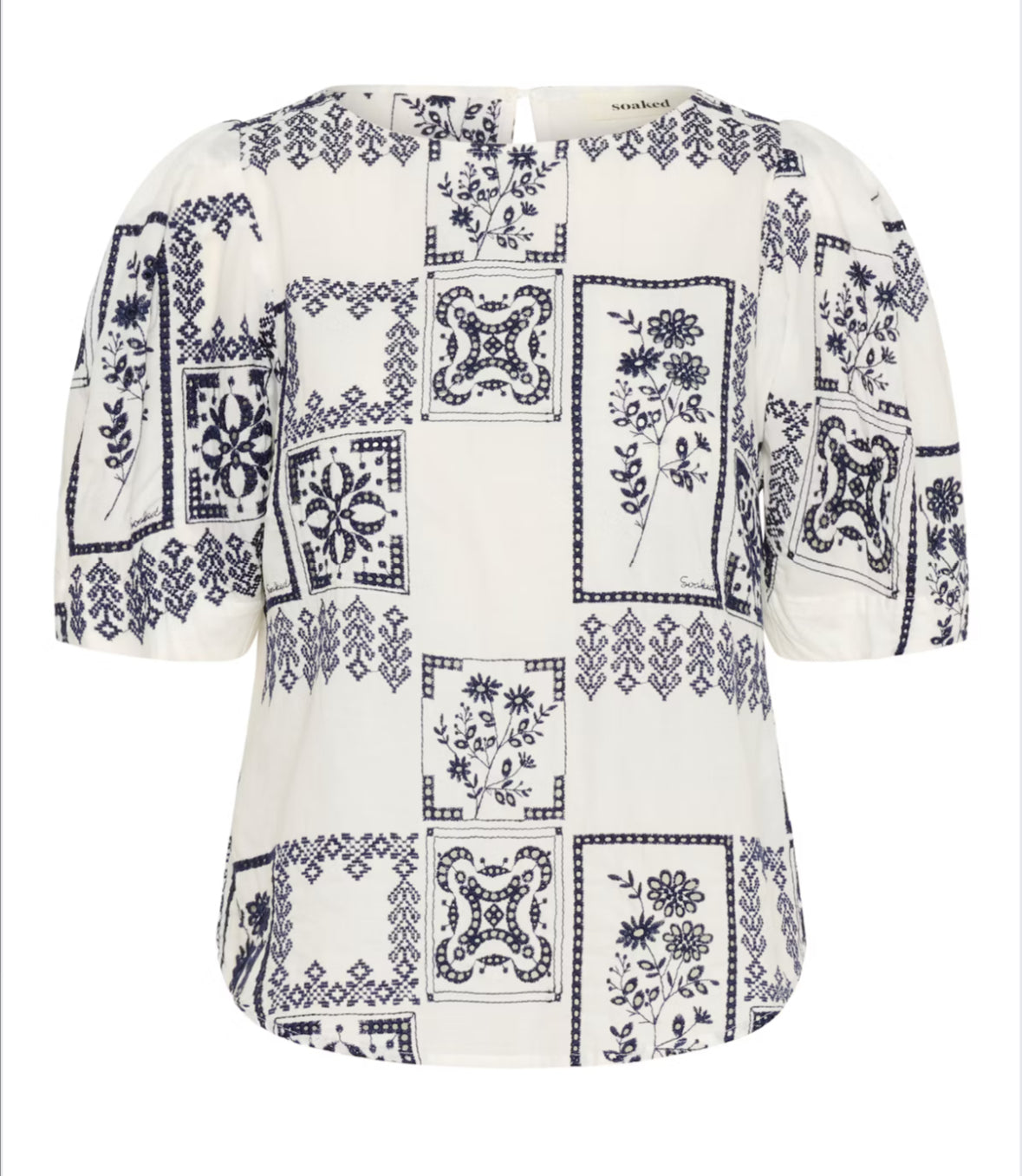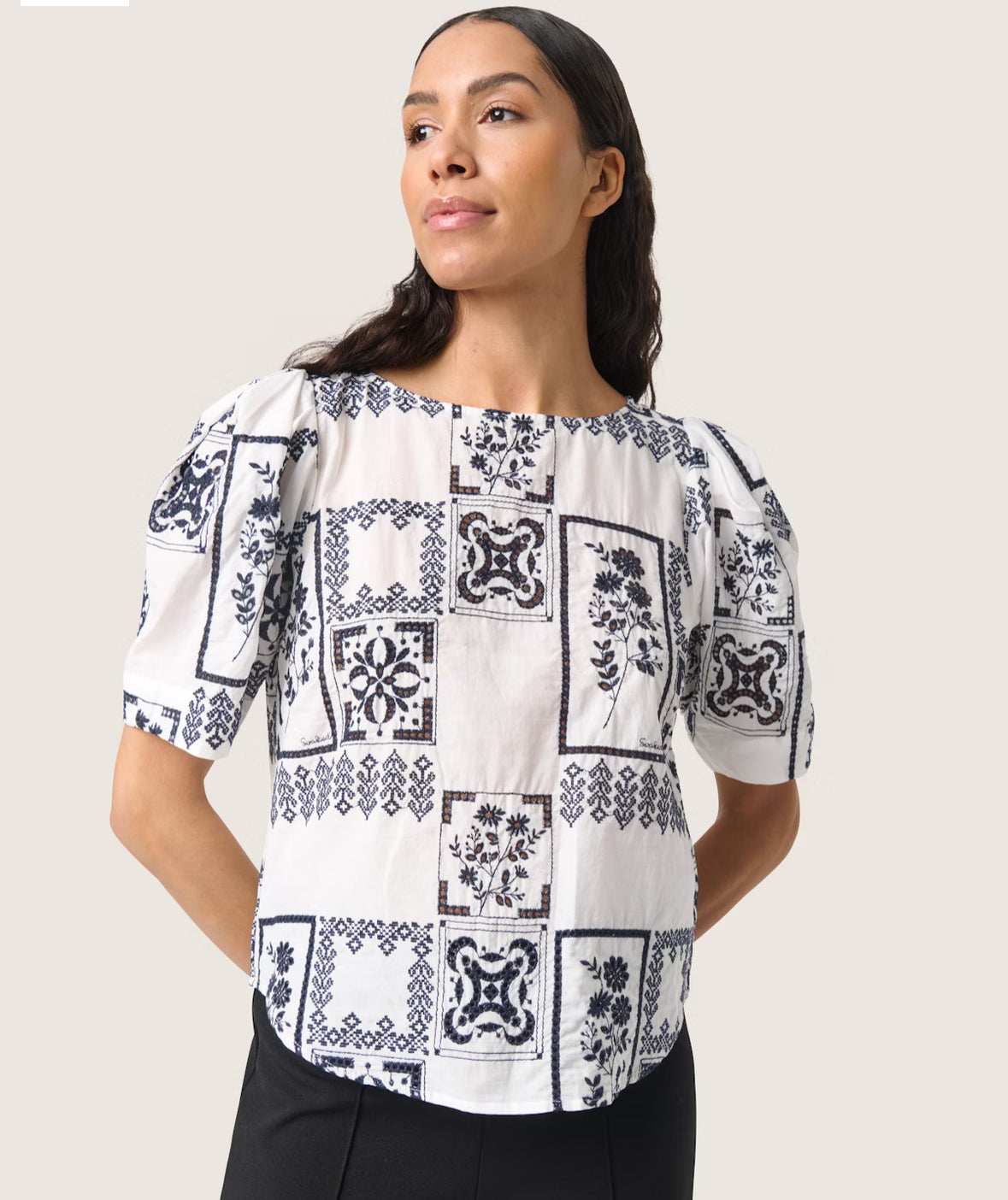 It's a unique blouse with a relaxed fit that comes in a playful white and navy geomatric design. Features short puff sleeves for a touch of fun and a button closure that adds a touch of elegance.