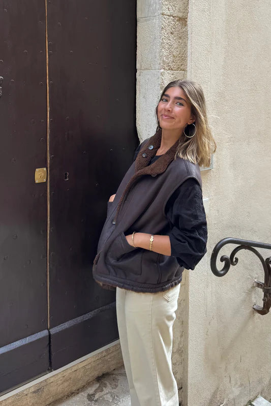 Switch up your style with this reversible teddy vest! One side features sleek nubuck-style fabric, while the other boasts a cozy teddy texture for extra comfort. With an elastic waist, it fits just right and adds a fun twist to your outfit.